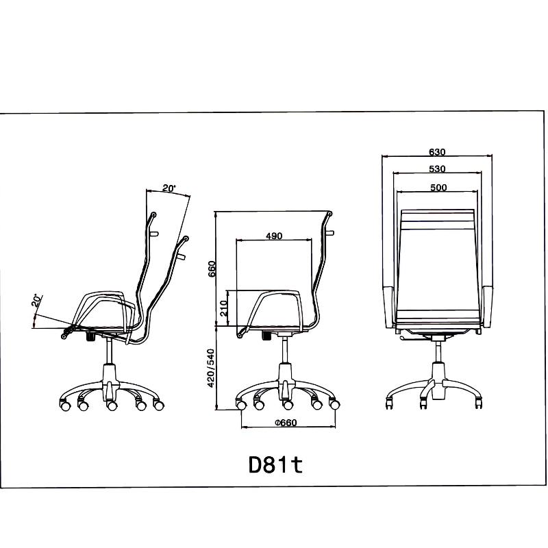 صندلی D81t در دو نوع چرم مصنوعی و پارچه تولید میشود و امکان سفارش با روکش مش نیز وجود دارد. دستههای این مدل ترکیبی از فلز و پلیمر با پد فوم انتگرال نرم هستند که راحتی بیشتری هنگام کار فراهم میآورند. پایه پنجپَر فولادی کروم و چرخهای رینگی کروم، علاوه بر استحکام، ظاهری مدرن و لوکس به این محصول دادهاند.
